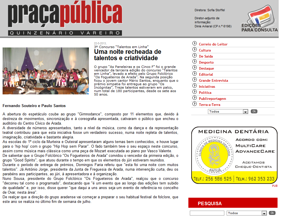 A edição nº 634 do Jornal Praça Pública, trás um artigo sobre a festa dos Talentos em Linha em Arada, evento no qual os grupos GimnoDance e GimnoKids estiveram presentes.